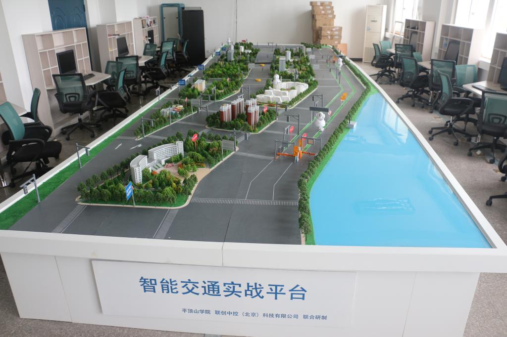 智能交通实战平台主要提供给学生一个测试平台的功能,台面上布置有多种形状的车道、路灯、高架、涵洞、车位、ETC、交通闸栏、红绿灯等结构,其内部自带控制系统和无线通信网络系统等构成。