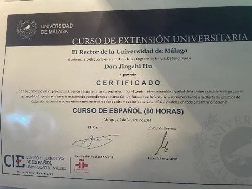 胡靖知,2138cc太阳集团2020级电子(中外)专业,2023年11月份来到了西班牙马拉加,正式开启了留学之旅。