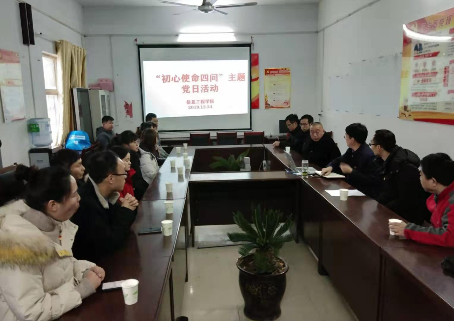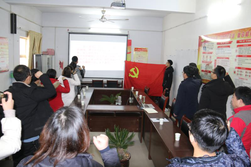 在圈李村村支部会议室,教工党支部召开了“初心使命四问”会议。大家面对党旗,重温入党誓词;在四问活动中,各党员干部纷纷发言,他们围绕“守初心、担使命、找差距、抓落实”总要求,结合“入党初心是什么、党员使命担什么、对照先进查什么、立足本职做什么”的问题,认真分析查找自身存在的典型问题,敞开心扉谈真体会、真感想。