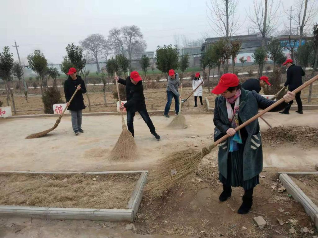 会后,党员同志们戴上志愿者帽,拿起劳动工具,将村上的公共场所打扫干净。