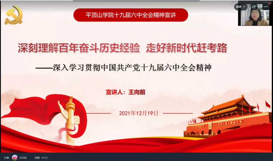 通过本次线上党的十九届六中全会精神宣讲,有助于同学们把思想活力转化为学习动力,以政治上的高站位、学习上的高标准、发展上的高质量,不断克服困难,严格要求自己,为学院“十四五”发展添砖加瓦。