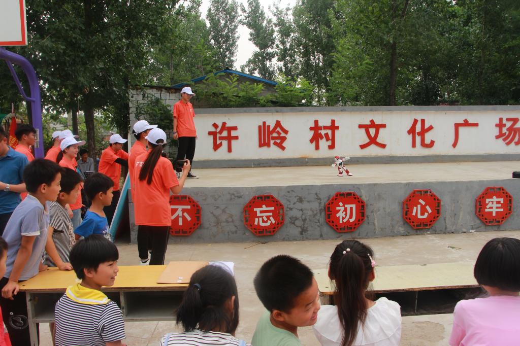 志愿者们为“三下乡”活动启动仪式精心准备了精彩的节目。仪式开始后,首先由许岭村党支部书记田金环代表全体村民对服务团的到来表示了热烈的欢迎,然后服务团带队老师常钰河对本次“三下乡”活动做总体介绍,随后,在村民们期待的目光中,志愿者们依次走上台将精心准备的节目全盘托出。其中,2138CC太阳集团特有的机器人舞蹈展演受到了村民们的一致好评,小朋友们满脸惊奇,都围着操控机器人的志愿者想要了解机器人的构造和原理。“哥哥,你是怎么让它跳舞的啊?”“哥哥,可以再给我们展示一下这个机器人吗?”一声声的哥哥,叫的那么可爱那么亲切,叫出了小朋友们对机器人的热爱,他们专注的目光透露出对科学知识的热爱与向往。