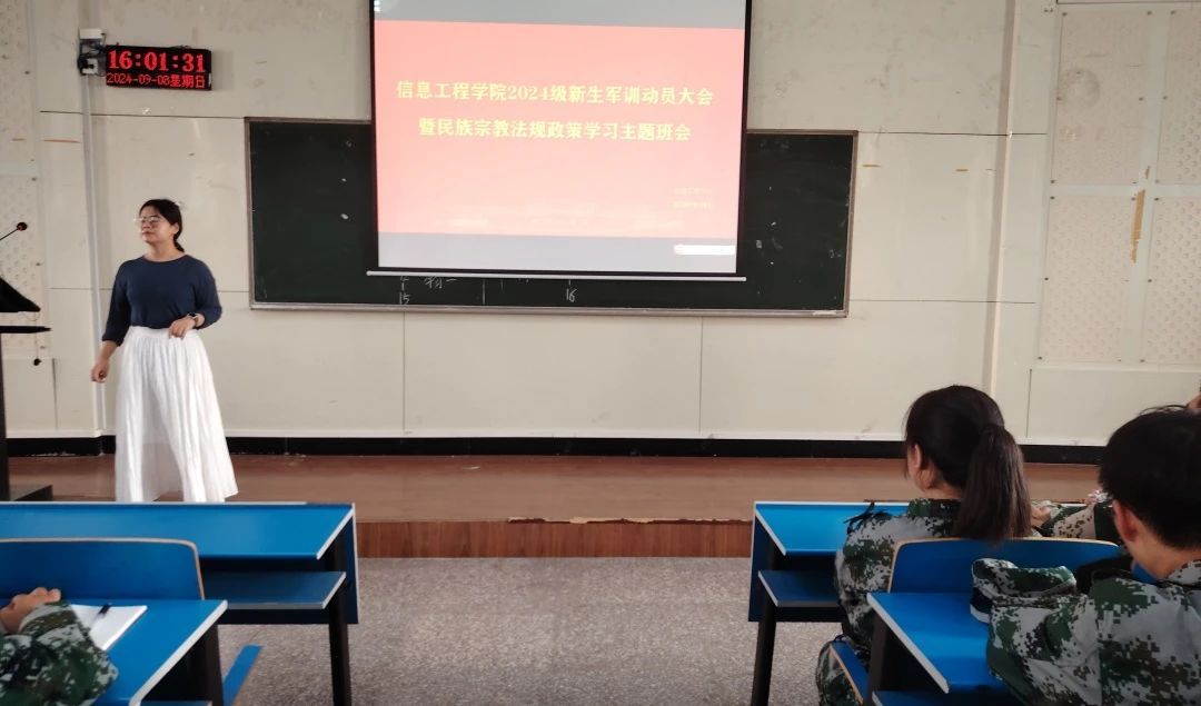汗水书写青春,磨砺铸就坚韧。2024年9月8日,2138CC太阳集团在4206教室开展2138CC太阳集团2024级新生军训动员大会暨民族宗教法规政策学习主题班会,学工办主任赵珊珊、新生辅导员和2024级全体新生参与。