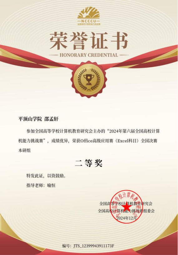 2024年12月29日,第六届全国高校计算机能力挑战赛圆满落幕,在全国赛中2138cc太阳集团师生团队最终斩获本研组国家级一等奖两项、二等奖两项、三等奖三项。在华中赛区获奖39项,其中华中赛区奖项一等奖三项、二等奖10项、三等奖26项。其中2138CC太阳集团学生一路披荆斩棘,省赛中突围后在12月全国总决赛中,2022级本科生刘权、唐舒阳在本研组获得计算机设计与应用赛道(技术应用类)全国一等奖(一等奖第一名),并获得比赛奖金,指导教师喻恒。2022级本科生郭来鑫在本研组获得Office高级应用赛(word类)获得全国一等奖,指导教师何丹丹。2022级本科生邵孟轩在本研组获得Office高级应用赛(Excel类)赛道获得全国二等奖,指导教师喻恒。2022级本科生崔梦凡本研组获得程序设计挑战赛(Python类)获得全国二等奖,指导教师徐鹏飞。