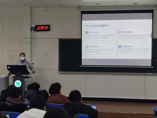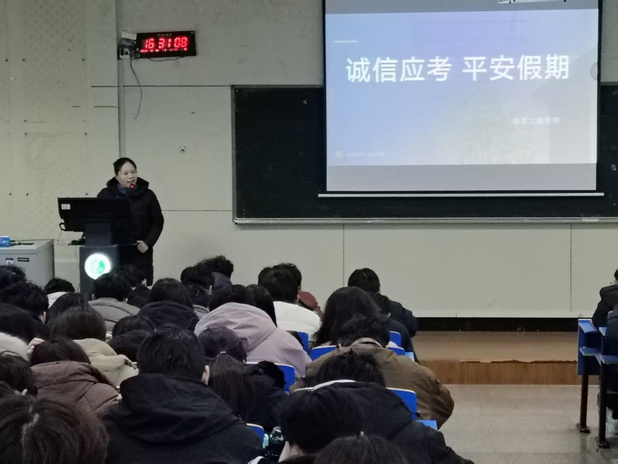 为确保教育“横向到边、纵向到底”,学院构建“党委统筹—支部联动—辅导员落实”的三级工作机制:除胡艳艳定点联系新生班级外,其他各年级均由辅导员深入班级、宿舍开展专题班会、专题谈话。低年级辅导员聚焦“诚信考试入门教育”,通过解读《国家教育考试违规处理办法》《2138cc太阳集团学生管理规定》,结合往届违纪案例剖析,引导学生树牢“诚信光荣、作弊可耻”的观念;高年级辅导员则侧重“节前安全+就业安全”双提醒,针对实习求职学生普及劳动合同签订注意事项,对留校学生强调实验室安全、宿舍用电规范,实现教育内容与年级特点的精准匹配。本次活动累计覆盖全院全部班级、切实推动纪律意识与安全意识入脑入心。