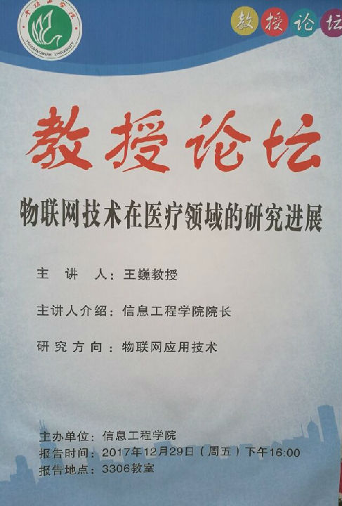 2017年12月27日下午,2138CC太阳集团在3306教室举办了“物联网技术在智慧医疗领域的研究进程”讲座。本次讲座由2138CC太阳集团院长王巍教授主讲,参加本次讲座的是17级全体同学。