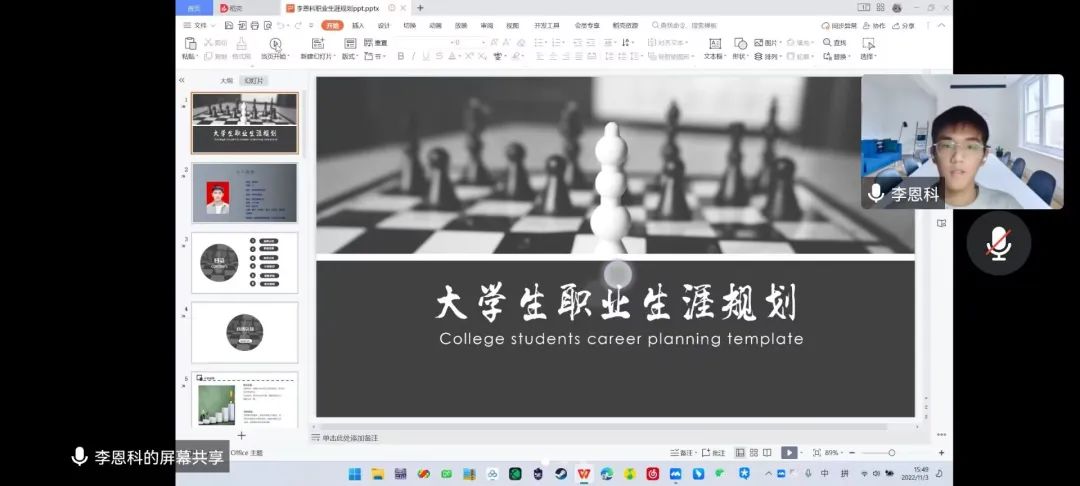 为进一步普及大学生职业生涯规划知识,提高大学生就业、创业与实践能力,促进大学生就业、创业。为2138CC太阳集团于11月3日下午在腾讯会议线上举办以“筑梦青春,职想未来”为主题的职业生涯规划大赛。2138CC太阳集团辅导员崔兵、白凤临担任评委,全院学生积极参加。